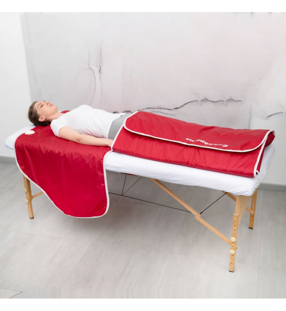 Электроодеяло для косметологии с 2 независимыми зонами прогрева от 35 до 55 градусов, влагостойким чехлом, функцией автоотключения через 1 час использования. Термоодеяло для обертывания легко чистится, конструкция одеяла с подогревом позволяет обернуть все тело или оставить открытой верхнюю часть в зависимости от процедуры. Электрическое термоодеяло благодаря карбоновой технологии согреет Вас мягким инфракрасным теплом. Одеяло для косметологии потребляет минимум электроэнергии, у электроодеяла 1 пульт на 2 зоны прогрева. Разрешена ручная стирка изделия. Подходит для обертывания, различных косметических процедур, где нужен прогрев. Размер 220х180 см, материал верха - нейлон с водоотталкивающей пропиткой, изготовлено в России, Санкт-Петербург, гарантия 12 мес.